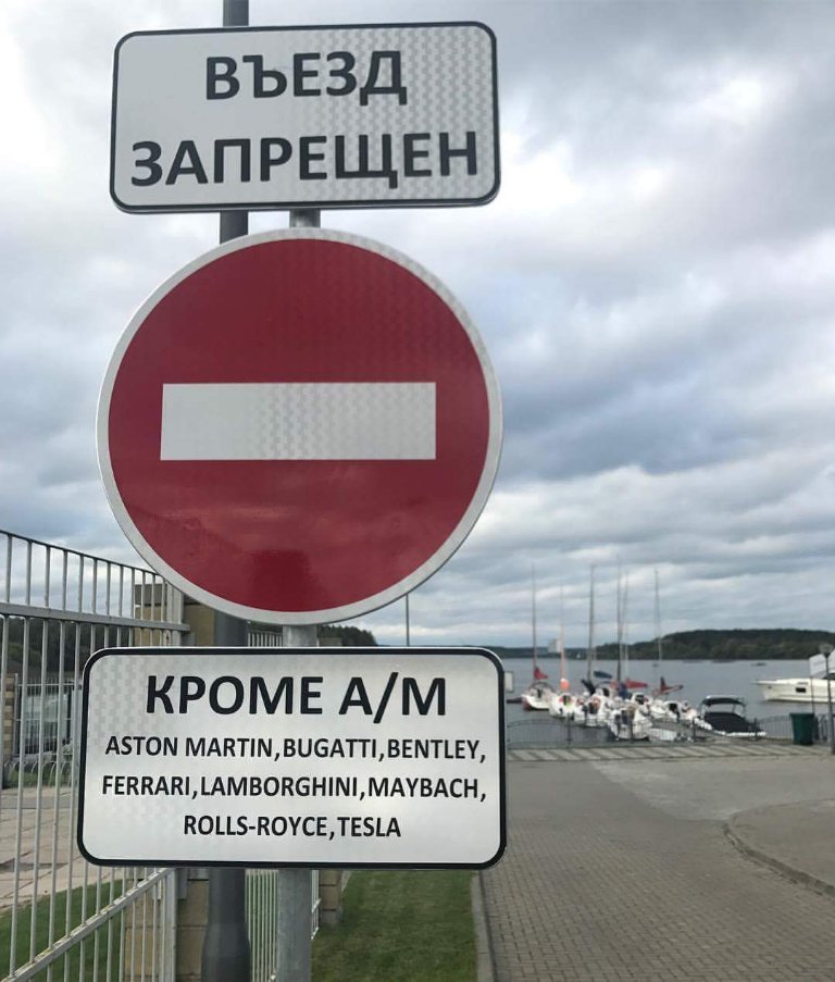 На выходных Павел сфотографировал у въезда на пирс на территории Robinson Club дорожный знак «Въезд запрещен», но снизу висела табличка, которая делает исключение для машин Aston Martin, Bugatti, Bentley, Ferrari, Lamborghini, Maybach, Rolls-Royce, Tesla. Как известно, это одни из самых дорогих марок авто в мире.
